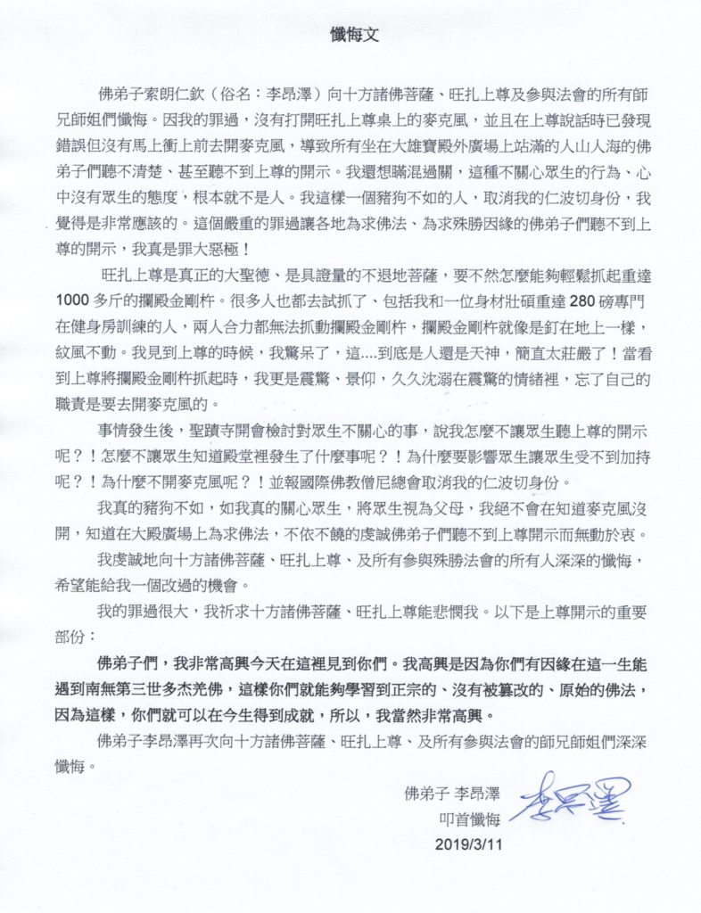佛弟子索朗仁钦(俗名:李昂泽)向十方诸佛菩萨、旺扎上尊及参与法会的所有师兄师姐们忏悔。因我的罪过,没有打开旺扎上尊桌上的麦克风,并且在上尊说话时已发现错误但没有马上冲上前去开麦克风,导致所有坐在大雄宝殿外广场上站满的人山人海的佛弟子们听不清楚、甚至听不到上尊的开示。我还想瞒混过关,这种不关心众生的行为、心中没有众生的态度,根本就不是人。我这样一个猪狗不如的人,取消我的仁波切身份,我觉得是非常应该的。这个严重的罪过让各地为求佛法、为求殊胜因缘的佛弟子们听不到上尊的开示,我真是罪大恶极!