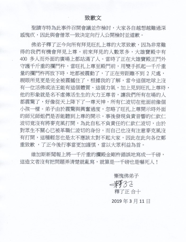 佛弟子释了正今向所有拜见旺扎上尊的大众致歉,因为非常难得的我们有机会拜见上尊,前来拜见的人数众多,大雄宝殿中有400多人而外面的广场上都站满了人。当时了正在大雄宝殿正门外守护千斤重的拦门杵,当旺扎上尊至殿门前,用双手抓起一千斤重量的拦门杵再放下时,地都被震动了,了正在旁距离不到2尺处,亲眼所见更是完全被震撼住了,根据我的了解,当今这个地球上没有一位活佛或法王能有这个体质、这个力气,加上见到旺扎上尊时,他的形象就是名不虚传活生生的大力王尊者,让我们所有在场的人都震惊了,好像从天上降下了一尊天神,所有仁波切在他面前像个小孩一样。弟子由于震惊与兴奋过度,忽略了旺扎上尊开示时外面的师兄师姐们是否能听到上尊的开示。事后发现负责音响的仁钦仁波切竟没有将麦克风打开,为此自私不负责任的仁钦仁波切,由于对众生不关心已被革职仁波切的身份,而自己也没有注意麦克风没有打开,这种轻忽也是太不应该太对不起大家,因此在此向各位郑重致歉 ,了正今后行事当更加谨慎,当以大众利益为首。