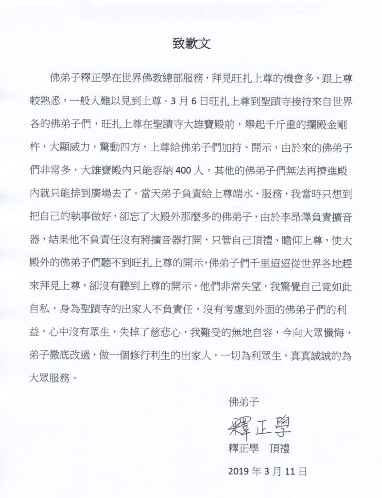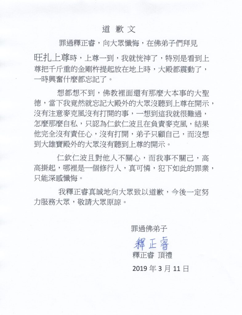 罪过弟子犯下了无法挽回的罪业,心里非常痛悔,实在太对不起大家。所以罪过佛弟子释正祥真心诚意地向诸佛菩萨、世界佛教总部及大众公开忏悔,致以最诚挚的道歉,祈求大家原谅,我今后一定更加努力服务大众,利益众生。
