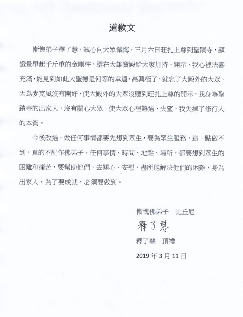 惭愧弟子释了慧,诚心向大众忏悔,三月六日旺扎上尊到圣迹寺,显证量举起千斤重的金刚杵,还在大雄宝殿给大家加持、开示,我心里法喜充满,能见到如此大圣德是何等的幸运,高兴极了,就忘了大殿外的大众,因为麦克风没有开好,使大殿外的大众没听到旺扎上尊的开示,我身为圣迹寺的出家人,没有关心大众,使大众心里难过、失望,我失掉了修行人的本质。
