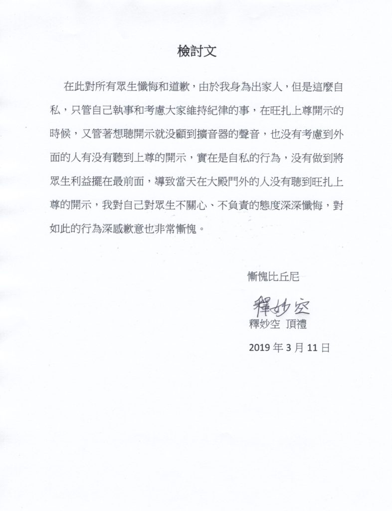 圣迹寺特为此事件召开会议并作检讨,大家各自越想越难过深感愧疚,因此与会僧众一致决定向行人公开检讨并道歉。