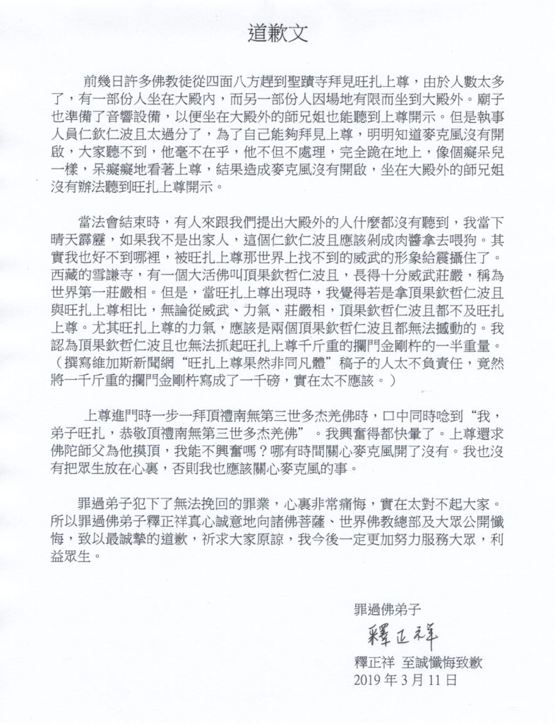 罪过弟子犯下了无法挽回的罪业,心里非常痛悔,实在太对不起大家。所以罪过佛弟子释正祥真心诚意地向诸佛菩萨、世界佛教总部及大众公开忏悔,致以最诚挚的道歉,祈求大家原谅,我今后一定更加努力服务大众,利益众生。